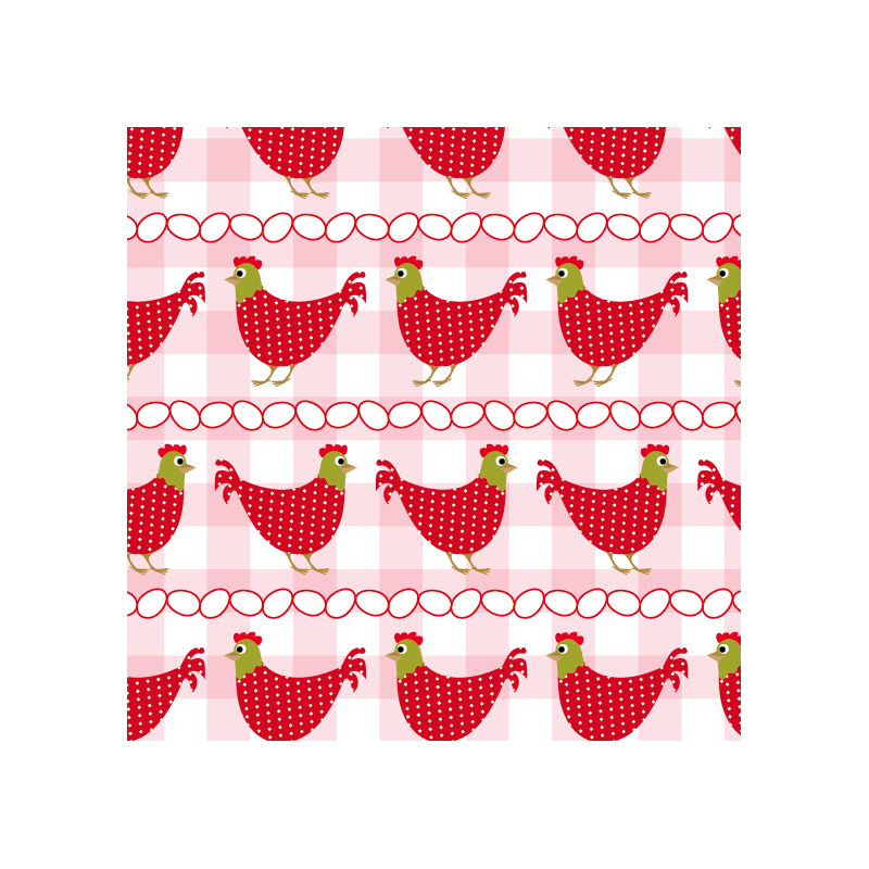 Des poules à pois rouges et à tête verte. Sur un fond vichy. Avec un peu d'imagination on pourrait se croire à Pâques.